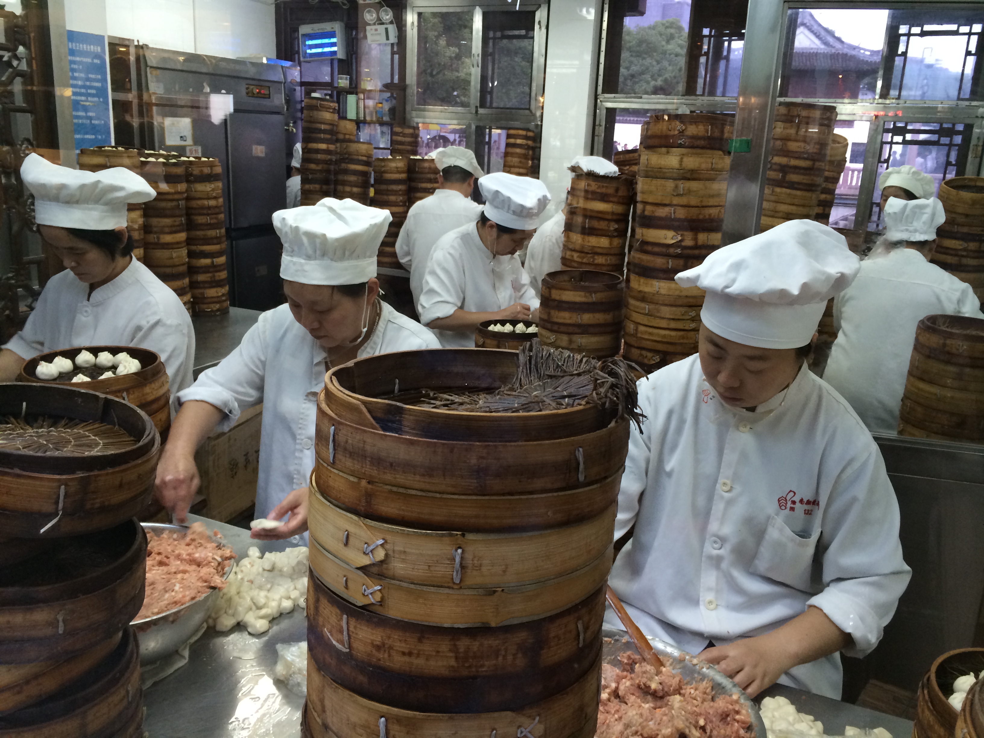 Busy workers inside the Nanxiang Steamed Bun Restaurant