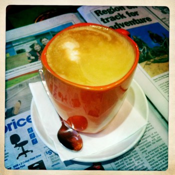 We took a seat at the long bench-like table at the back of the cafe since there were no other available seats, it was that busy. I didn’t particularly want to sit at the long table because that means that other people are sitting there too and I have already gone through my hesitance to share things. Apparently it doesn’t just stop with my food. Sure enough not long after we sat down, three more people came and sat directly in front of us, rather than the other end which was as far as I could see void of all life. Ah, never mind. While we were reading Monday’s edition of The Cairns Post MS pointed out that there seemed to be a lot of staff doing pretty much nothing and just standing around watching the one on the coffee machine. Meh. As long as our coffee and food arrived in ample time I didn’t really care. Our coffees did arrive in ample time and our food not long after.