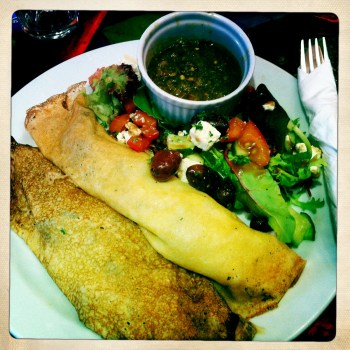 Crepe Trip – Sauteed Mushrooms, Zucchini and Onion in a reduced Sour Cream Sauce wrapped in Crepes accompanied by a side of Greek Salad (AU$15.90) with extra Green Chilli Sauce (AU$2.50)