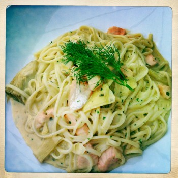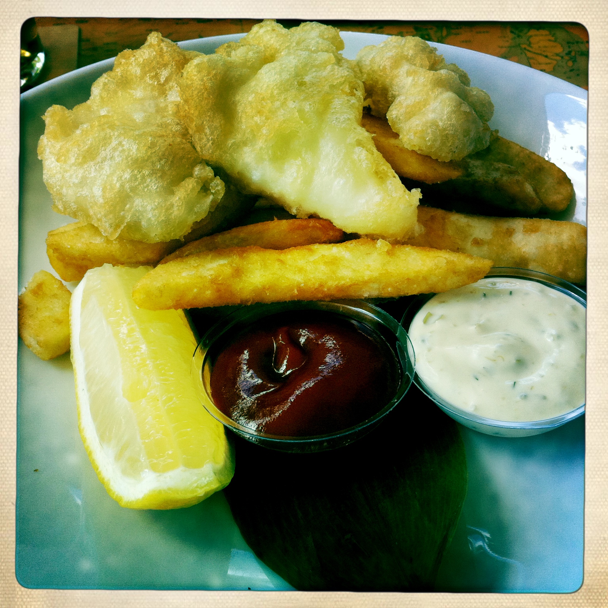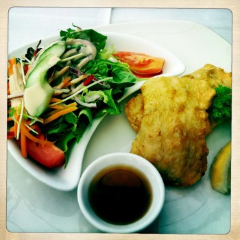 I perused the menu and went with the Barramundi and Salad (Estuary Fish in Tempura Batter Served with Salad) but I’ll be honest there wasn’t really anything on the menu that excited me. Nothing on the menu stood out to me and made me think ‘That’s what I’m ordering!’ Our meals arrived in ample time. FW and TT also ordered the same dish as I did while across from me HT ordered the Pasta of the Day, which was a Creamy Salmon number. It was quite a large serve of pasta especially considering it was only $16.90 but HT claimed it was very bland. I tasted it and it was very bland. Half a bottle of Tabasco Sauce would have made it a little more worthwhile but then again everything tastes good with Tabasco Sauce.