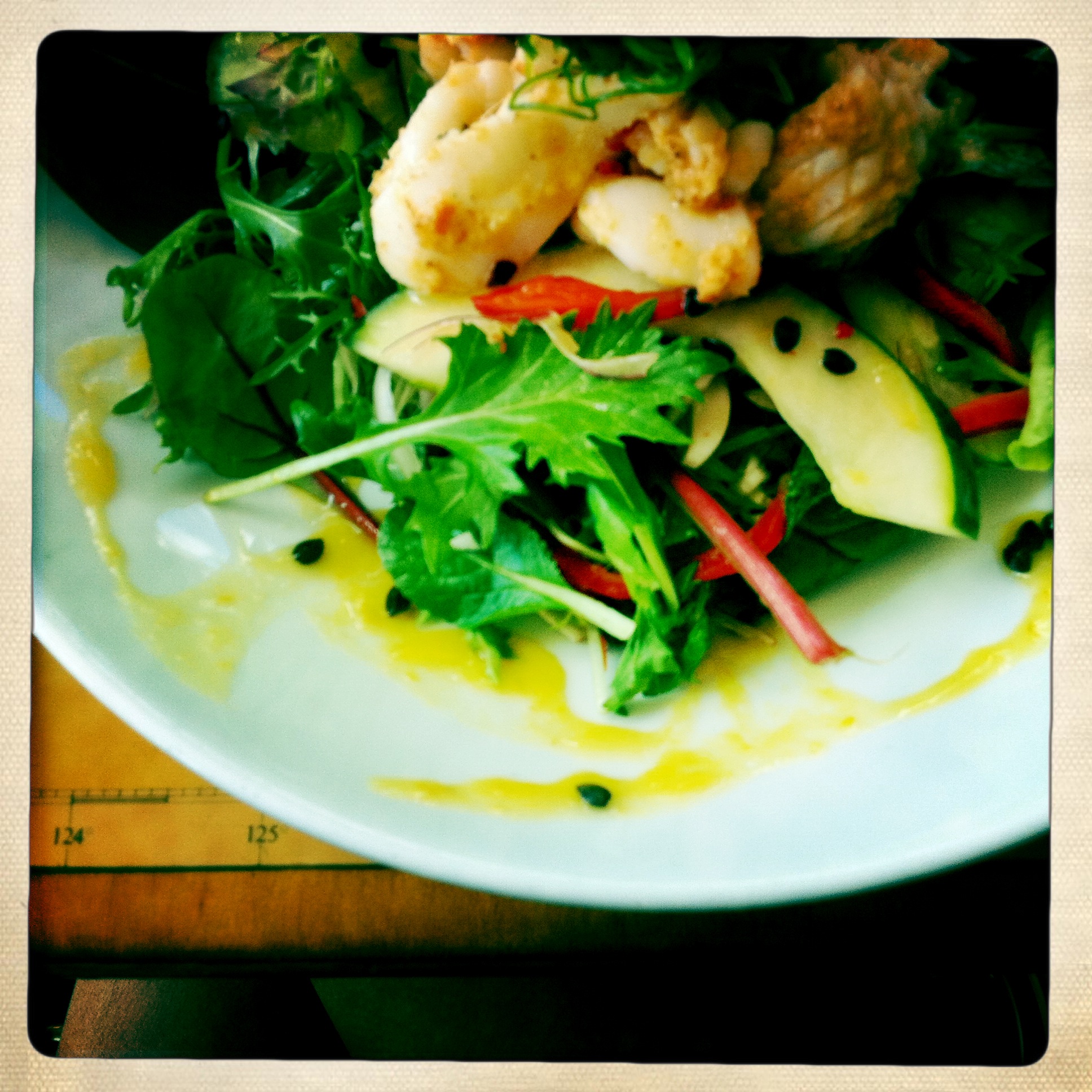 I ordered the Chilli Squid and Cucumber Salad with Spanish Onions, Shallots, Mesculin and Passionfruit Dressing. On ordering I asked the waitress if the squid was imported and I was assured that it wasn’t however I wasn’t entirely convinced with her assurance, she seemed a bit unsure.
