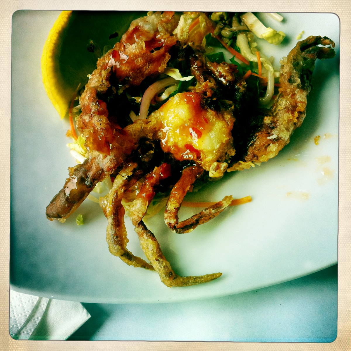 Oh how I love my lunches in town on the weekends and again I thought I would take advantage of another one of the lunch specials going in the city but this time at The Raw Prawn on the esplanade. The Raw Prawn is a local seafood restaurant situated in a great spot on the esplanade that has been open for over 10 years. I have been here for lunch a few times and always enjoyed it. There is $22.50 lunch specials which includes two courses plus a glass of wine, beer or soft drink. There is also a $14.90 lunch special which is just for a main but my friends and I opted for the more expensive one ordering an entree and a main along with a couple of glasses of white wine and a beer. There are 9 entrees to choose from, 10 mains and 3 desserts. Again, its not all just seafood and there is a couple of non-seafood dishes for the non-seafood lover. AL ordered the Soft Shell Crab with Crisp Garlic Flakes and Sweet Chilli on a Thai Salad for entree and for a main he ordered the Chicken Pasta thigh pieces tossed with garlic and olive oil, since he isn’t that much of a seafood lover.