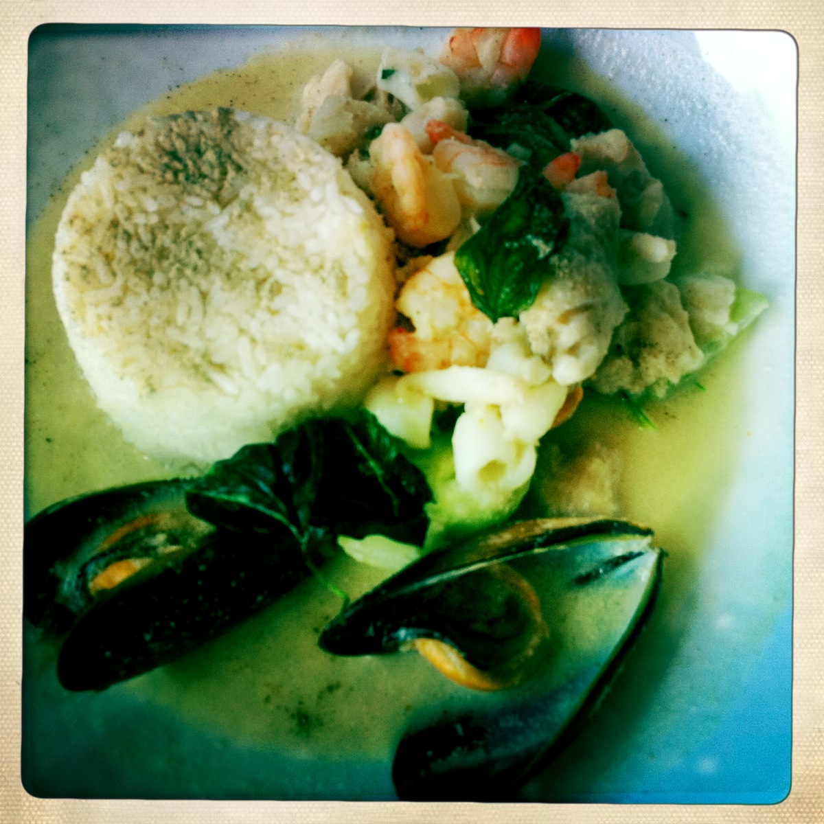 Pacific Fusion Reef Fish, Prawns, Calamari and Mussels poached in coconut basil sauce with rice and bok choy