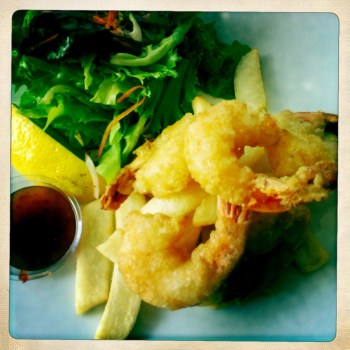My meal, as the menu explained it, was just two pieces of fish on a plate with a bit of salad and a very light soy type sauce that pretty much dissolved into nothing when I poured it over the fish. A bit of an odd sauce to have with tempura fish I think. Aioli or the old favourite Tartare Sauce would have been more memorable. The barramundi was cooked well and tasted nice and fresh. The batter encasing the fish was crisp and golden. I just wasn’t feeling it I guess. It must be said that FW and TT enjoyed their Barramundi and Salad lunch more than I did.
