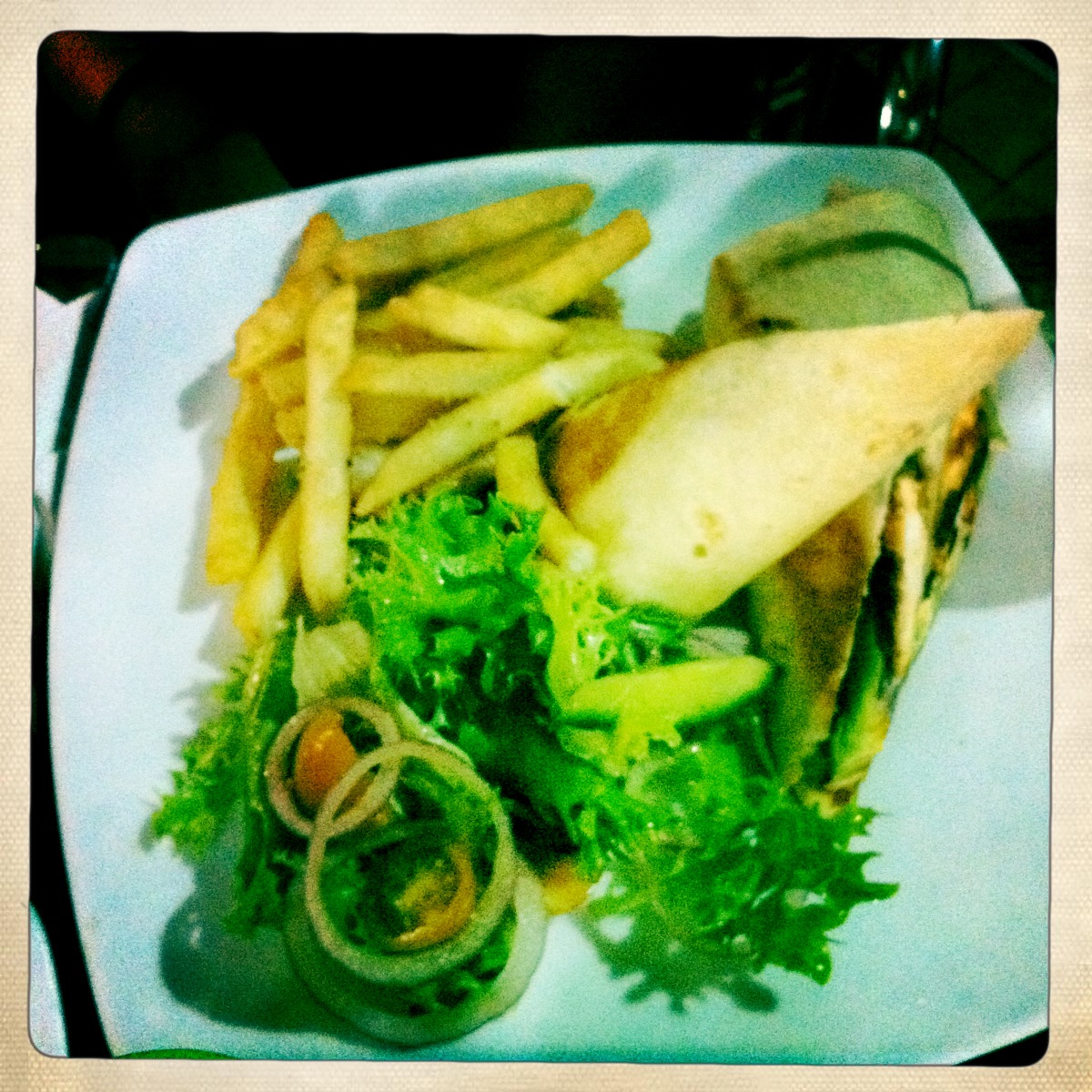 My three friends and I ordered at the bar and then took up a table out the front near the footpath so we could people watch. We probably only waited about 15 minutes for our food, which was a nice change from some other restaurants I have been to lately. All wraps and burgers come with chips and your choice of Garden Salad or Caesar Salad. SM ordered the Portugese Chicken Wrap with Peri-Peri Tenderloin, Grilled Onion, Feta, Avocado and Roasted Peppers (AU$12.90). In her words it was ‘pretty good’ and she gave it a 7/10.