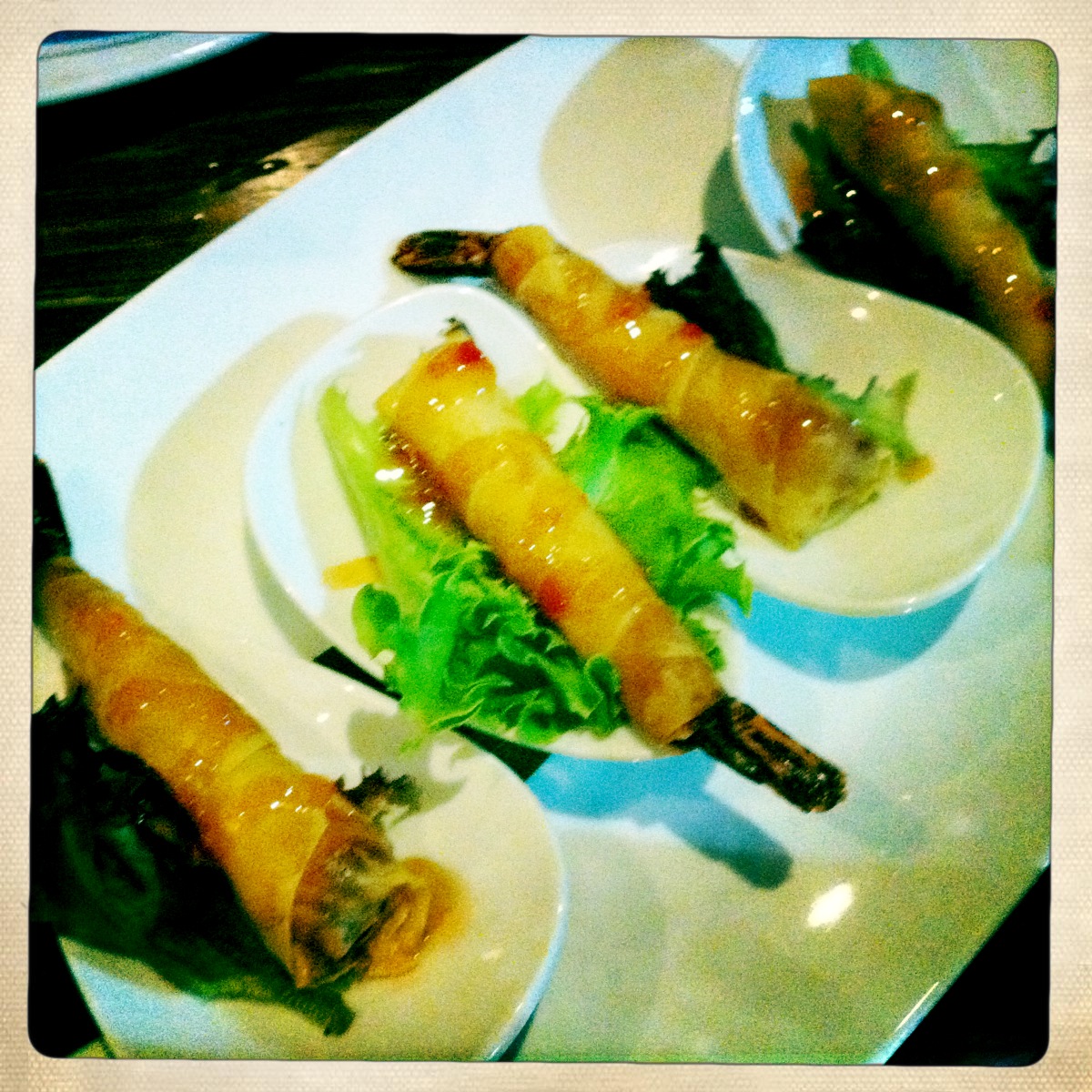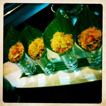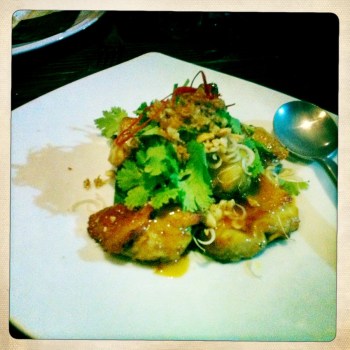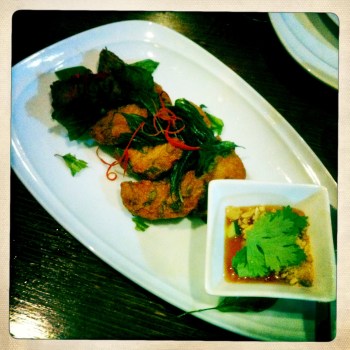 One of the best things about Iyara Restaurant and Bar is the decor and the view. We were seated out on the balcony, overlooking the esplanade. The city was alive with people strolling along the foreshore and the full moon rising against the mountain backdrop. Inside, the atmosphere in the restaurant is relaxing yet classy with candles flickering, comfy couches, oriental vases and sleek wooden floors. It didn’t take long for our entrees to arrive and it wasn’t just my camera (ok iPhone) that emerged to take photos of them. The entrees looked and tasted delicious. Feng gave us a rundown of the entrees that he has selected for us paying particular attention to the Mieng Kham – Betel Leaf Served with Shrimp, Coconut, Ginger, Peanut, Chilli and Fresh Lime (AU$15). He told us that this entree either needed to be eaten first or last to truly taste the dish. Since it looked so good, it got eaten first. Everyone thought it was divine and I found myself a little sad that we only got one each. Oh well, onto the other entrees.