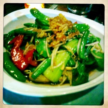 Now onto the mains… They arrived in good time as we were only left waiting for about 20 minutes. Along with my Chicken and Lemongrass dish (Gai Takroi) Feng had chosen us the Gaeng Massaman Neur – Rich Massaman Curry of Chuck Beef, Potato, Peanut and Shallot (AU$28), Pla Sam Rod – Boned Fried Whole Barramundi with a Hot, Sweet and Sour Sauce Garnished with Thai Basil (AU$34), Pad Pak – A Fresh Stir Fry of Green Asian Vegetables with Thai Basil (AU$19). Feng served us each a portion of steamed Jasmine Rice each and we all tucked into the mains in front of us (sharing of course). The Gai Takroi was placed closest to me so naturally I tried that one first. The chicken served in bite sized pieces was succulent and tender. Everyone enjoyed this dish.