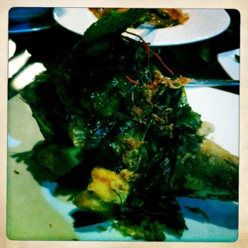 Lastly, was the Whole Barramundi and wow did it look good. Once again everyones cameras or phones came out to take a picture of the meal. The Barramundi had been deep fried whole with bite sized pieces of fish fillet for us to share around. Once that was gone however the crispy fish was broken into pieces and eaten skeleton and all by the four of us. I asked Feng where he sourced the Barramundi from and he said that it was farmed Barramundi from Australia. The reason that he bought farmed Barramundi to serve at Iyara is because of its bred to plate size (something I did actually already know but I thought I would ask anyway).