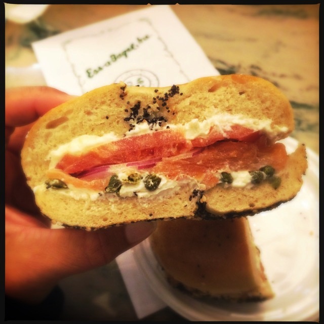 The bagel teams assembling the bagels at the front of the store were like a well oiled machine and there were so many different ingredients to get on your bagel including 18 different flavours of cream cheese with everything from raisin walnut cream cheese to jalapeno cream cheese to chocolate chip cream cheese. The choices of what you could have on your bagel were literally endless, so much so that I found it a little overwhelming. I tend to stick with tradition and can’t go past the Lox (Smoked Salmon as we call it) with Cream Cheese and Capers.