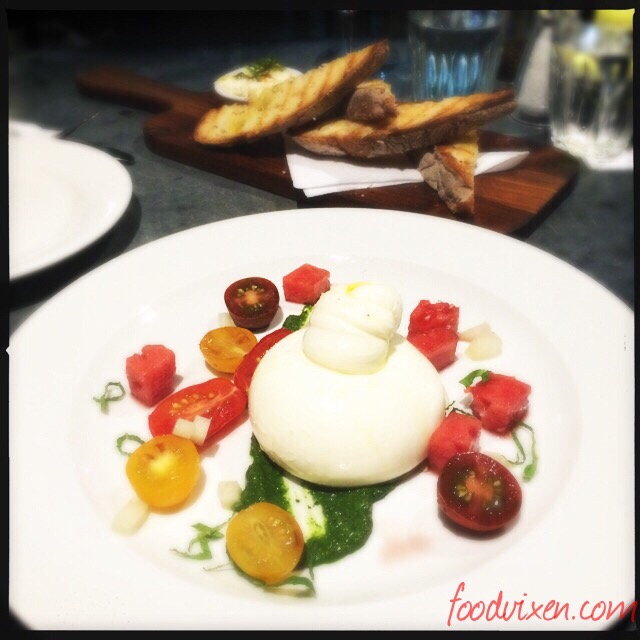The Burrata Caprese with Heirloom Tomato, Watermelon, Rocket Pesto and Raspberry Vinegar (AU$21) and the Garlic Bruschetta with Fresh Ricotta, Mint and Calabrian Chilli (AU$9)
