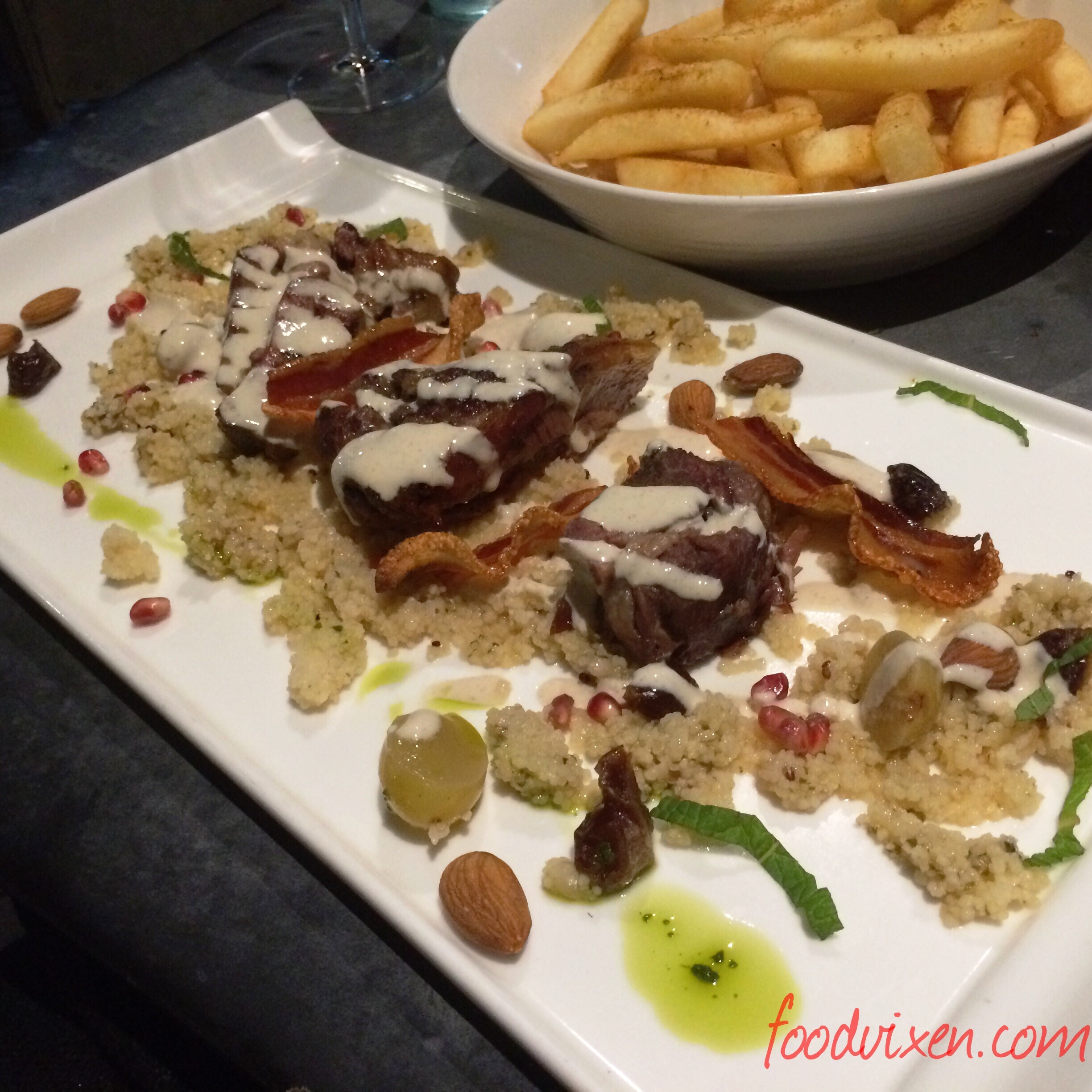 Next up for our mains MS had ordered the Pork Spare Ribs with Fennel, Apple Cider Vinegar and Pickled Pineapple (AU$37) which came with a big bowl of chips and I had the 8 Hour Lamb Shoulder, 3 Wheat Salad, Almond, Mint, Pomegranate and Spicy Cumin Yogurt (AU$36).