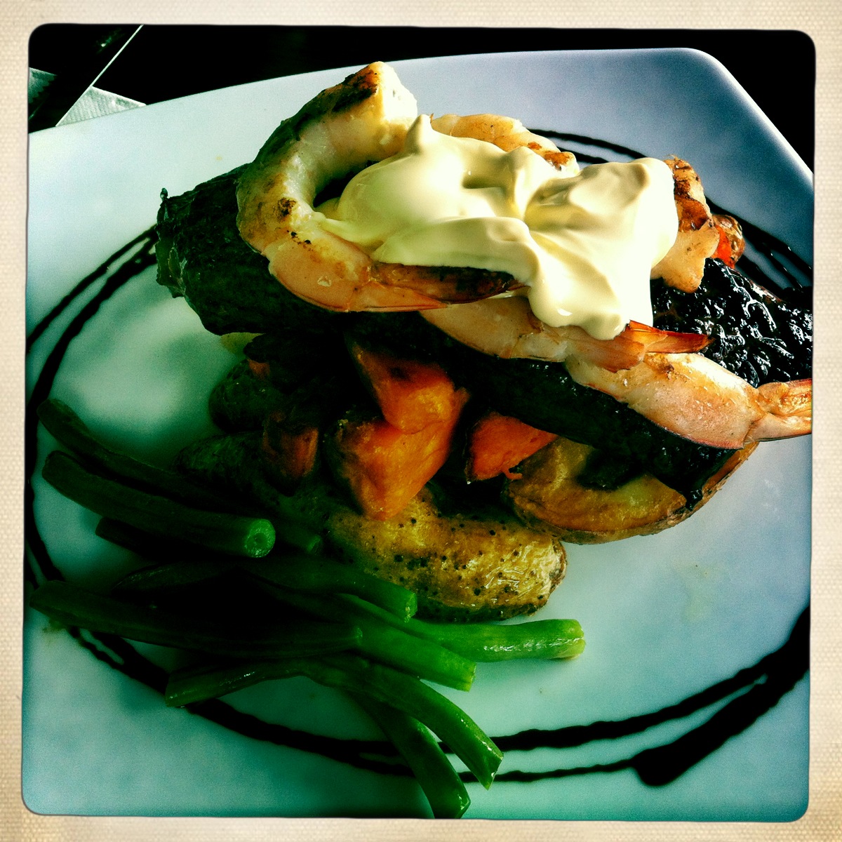 Next stop on the Table 52 bandwagon was Vibe Bar and Lounge for lunch last week. I went to Vibe for dinner on a Tuesday night about a year ago when they had their 2-4-1 burger special. Back then their burgers were huge and I’d have to say one of the best in town. At present I can’t comment on the burgers because I haven’t had one since then. Unfortunately they don’t have their 2-4-1 burger specials anymore but according to the waiter that served us last week the ‘powers that be’ at Vibe decided to make their burgers cheaper everyday instead of just on Tuesday’s. Fair enough. So back to my post… When MS and I went to Vibe for lunch last week we were greeted at the counter by the friendly waiter who took our orders. MS went with the 350g Angus Rump Served With Grilled Vegies and Hollandaise for AU$25 while I figured if I was going to have steak I might as well have seafood too so I ordered the Reef and Beef – 250g Scotch Fillet, QLD BBQ King Prawns, Hollandaise Sauce, French Beans and Sweet and Kipfler Potatoes for AU$25. MS ordered his steak to be cooked Medium while I ordered mine Medium Rare. We opted to sit inside but then decided the atmosphere just wasn’t very pleasant (it is a nightclub) so we moved to an outside table where we could people watch and drool over a group of tourists eating bowls of noodles from next doors Pho ‘n Thai while we waited for our meals (just to clear things up we were drooling over the noodles not the tourists).