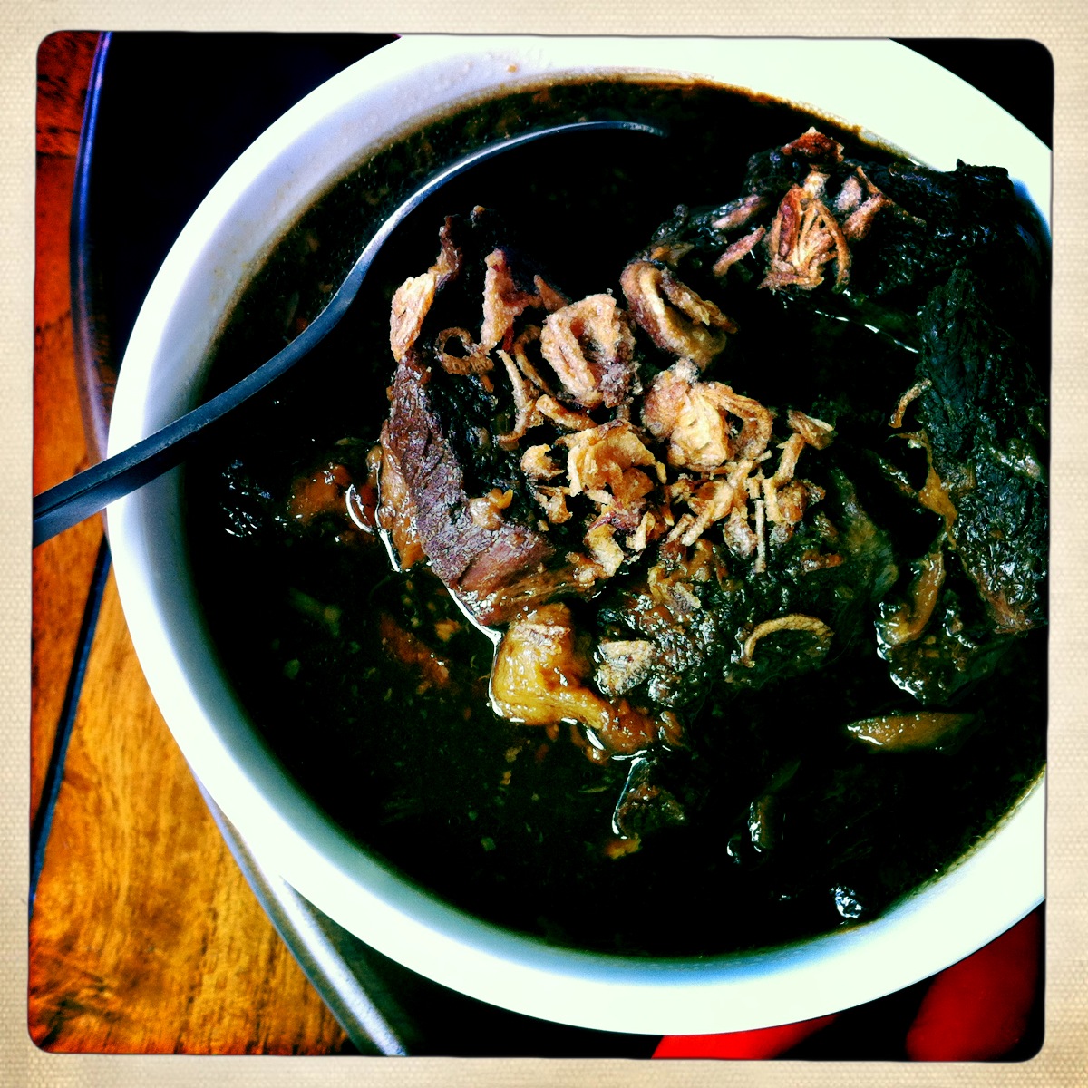 Then not long after that my Seafood Udon and Tofu and Seaweed Salad arrived, again confusing the hell out of the guy serving me. He couldn’t figure out why I had two meals and RS had a cup of water. So enough about that crap… Let’s get onto the food. My Seafood Udon had two large whole prawns floating around in it that by all accounts looked local to me (winning), plus half a mussel, some broccoli and a couple of other bits and bobs in there. It was steaming hot, almost too hot to eat but it was delicious.