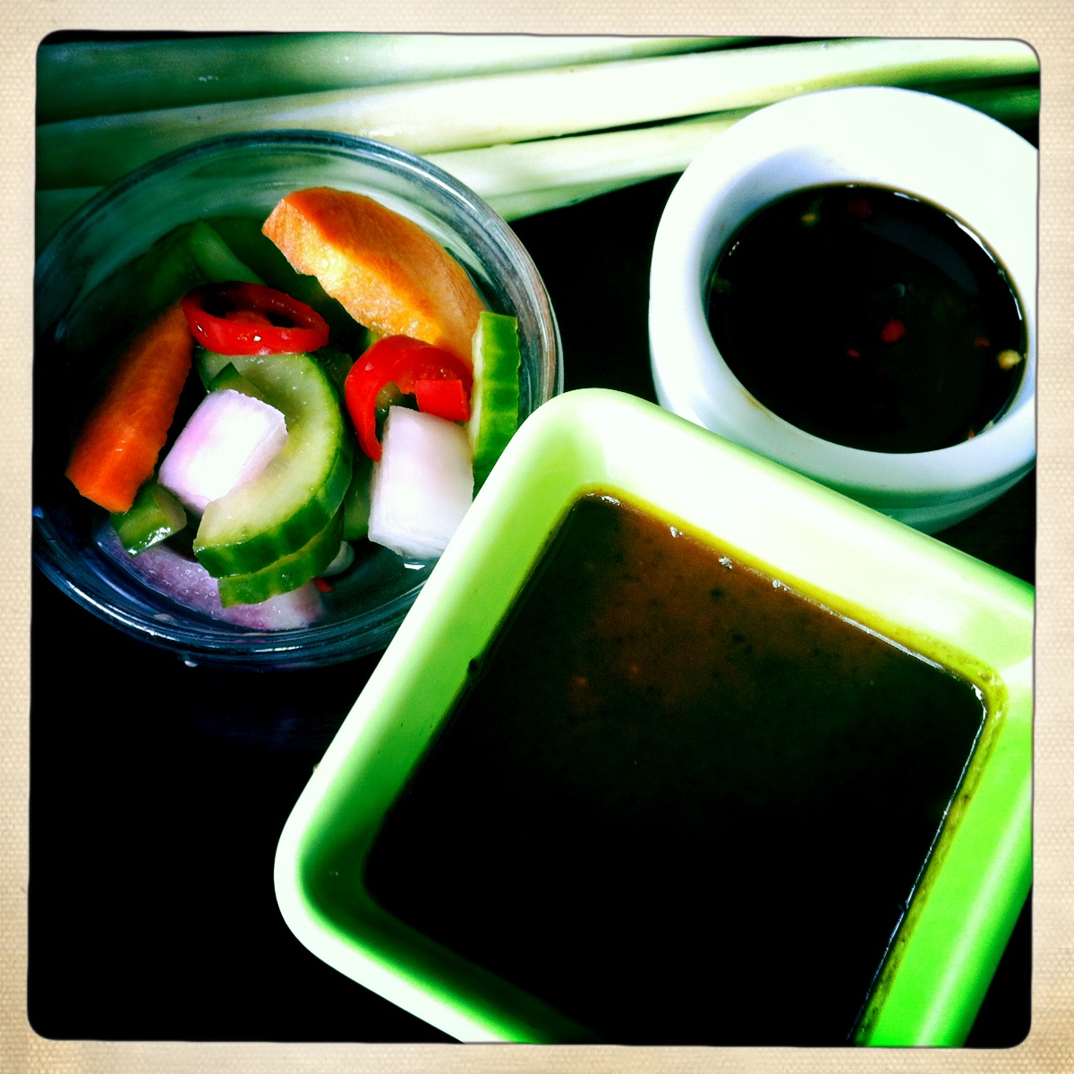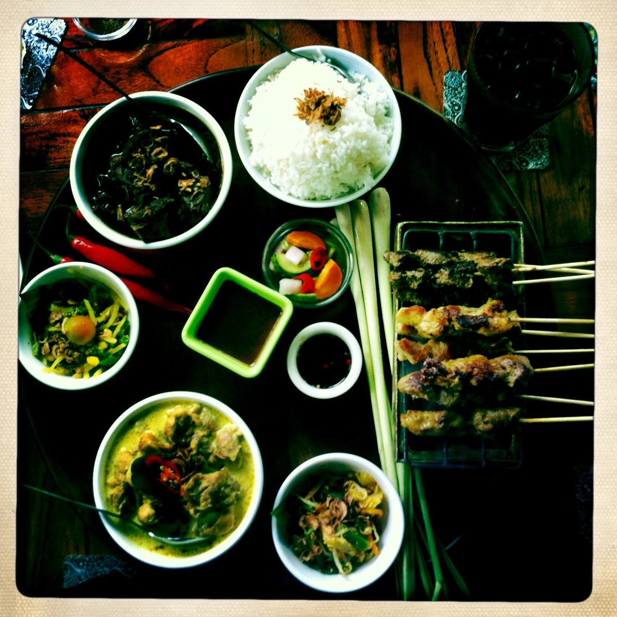Last post on the 21st of June? Geez I have been slack! Apologies again for I have been out of phone range and this is a post I was supposed to do before I was so rudely interrupted to go to work. So MS and I finally made it to the Bayleaf for lunch after many attempts to go there. We went there for a Friday afternoon lunch date with MS’ dad a couple of weeks ago arriving to a restaurant with only a few occupied tables. Sitting down outside near the line of trees along the pathway and the unlit bamboo torches (well it was daytime) we were given menu’s from the waitress and all identified the Balinese Set Lunch for $19.50 per person as what we wanted to eat. The Set Satu consists of Green Papaya and Vegetable Salad, Mixed Sates (that’s how they spell it on the menu), Balinese Chicken Curry, Pork in Sweet Soya Sauce and Fresh Tropical Fruits all served with Steamed Rice, Daily Vegetables, Peanut Sauce and Condiments. All that for AU$19.50 I hear you say? Sh*t yeah!
