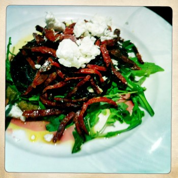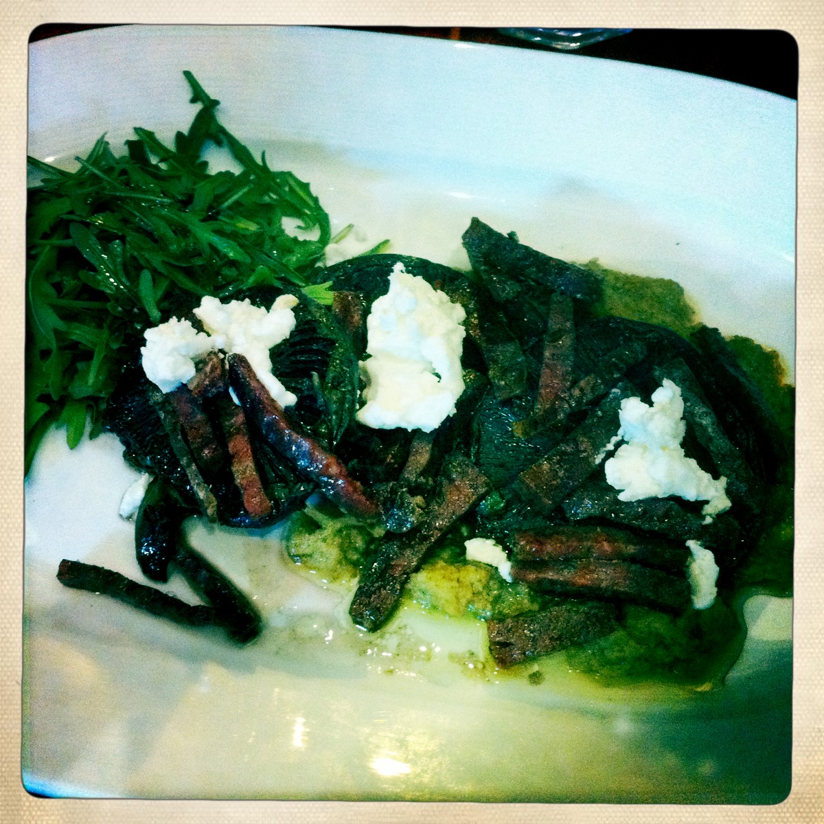 Herb braised field mushroom with cacciatore sausage and goats cheese on wilted rocket with green olive puree and red wine caramel (AU$28.00)