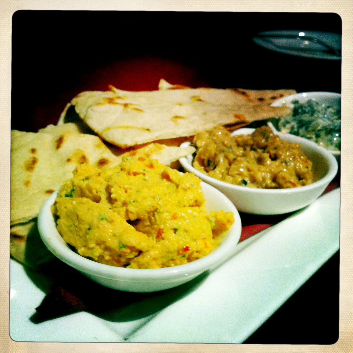 The Turkish Dips -A trio of flavoursome Turkish inspired dips: Roasted Red Pepper and Fetta Hummus, Eggplant and Black Olive and Spinach and Yogurt served with Grilled Flatbread (AU$7.90)