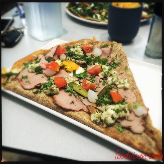 She chose a Traditional Crepe with Creamy Goats Cheese, Homemade Onion Jam, Toasted Almonds, Cherry Tomatoes, Cheese and Spinach while after a tough choice I ended up choosing a Gourmet Crepe with Medium Rare Roast Beef, Homemade Tartar Sauce, Egg, Cherry Tomatoes, Cheese, Cornichons and Baby Spinach. Initially I did think that the prices were a little high – a couple of the Gourmet Crepes are around the $23 mark I instantly changed my mind when I saw the sheer size of the things and the generous toppings.