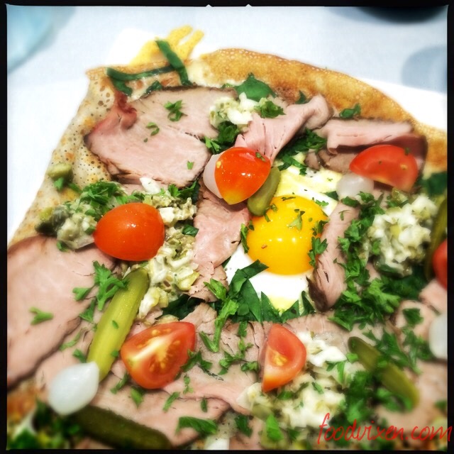 Gourmet Crepe with Medium Rare Roast Beef, Homemade Tartar Sauce, Egg, Cherry Tomatoes, Cheese, Cornichons and Baby Spinach