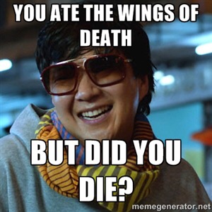 So now you understand how competitive things can get between us I shall go back to my original story. To cut an already long story short the death wings arrived at the table and out of the 9 people there only 3 of us ate a Wing of Death – myself, my dad and the Birthday Boy. My brother put his finger in the chilli to taste it and cried like a little baby, my Sri Lankan mother who barely consumed a ‘bee’s d*ck’ of the sauce made an awful racket about how badly it burned and then the rest of the table just down right refused to go anywhere near it.
