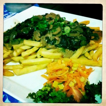 We didn’t wait long for our meals to arrive and when they did we were all pretty staggered at the size of the schnitzel. Well, the special board did say XXL! CM managed to polish off the entire thing as well as 2L of beer minus a few stray chips left on his plate while MJ struggled to finish it all. They both reckoned it was a pretty good deal and enjoyed it although they did say that the schnitzel was a little bit tough and chewy in parts and they also suspected that the mushrooms in the mushroom sauce may have been tinned.
