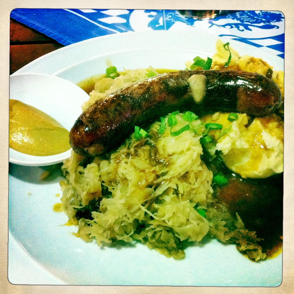 Only two other tables were occupied by diners on this particular Thursday night but I have driven past many times and noticed that it has been very busy mostly on the weekends. CM and MJ both ordered straight from the specials board – an XXL Schnitzel with Chips, Mushroom Sauce and 1L of beer for AU$29 (that would be their 2nd litre of beer for the evening) while seeking to satisfy my odd craving for sauerkraut I ordered the Kilsekransky, a Grilled Cheese Kransky served with authentic German Sauerkraut, Mashed Potatoes and Bavarian Mustard (a bank breaking AU$9.50).
