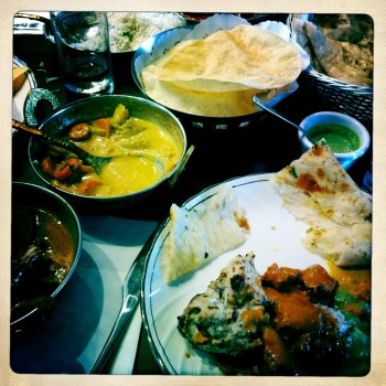 The decor at Mother India was a little dated but also very homely and cosy so it was kind of nice. There was a beautiful big tapestry on the wall behind us that looked very expensive and also looks good in a photo. I was just happy that we were sitting inside in the air conditioning as opposed to outside at some other restaurant. When you are eating hot food you don’t want to be sweating from both the food and the ambient temperature. I pointed out to EG the newly wed Indian couple seated behind us (noticeably newly wed because of the traces of henna on her hand and the large amounts of bangles she displayed on her forearms). They couldn’t have been more disinterested in each others company. Shame since they had probably only been married a couple of days. There was also a young child that from another table that kept harassing me because he apparently thought I was his mother due to me having a similar haircut as her (she wasn’t at the restaurant). *Insert my super awkwardness with children*. I’ll be honest I do want kids one day but I’m sure I am not alone when I say that I don’t like other people’s kids, hopefully I will like my own. Moving on, we waited probably about 15 minutes for our meals to arrive and when they did I realised just how much food the two of us had ordered especially considering we had already had papadums earlier.