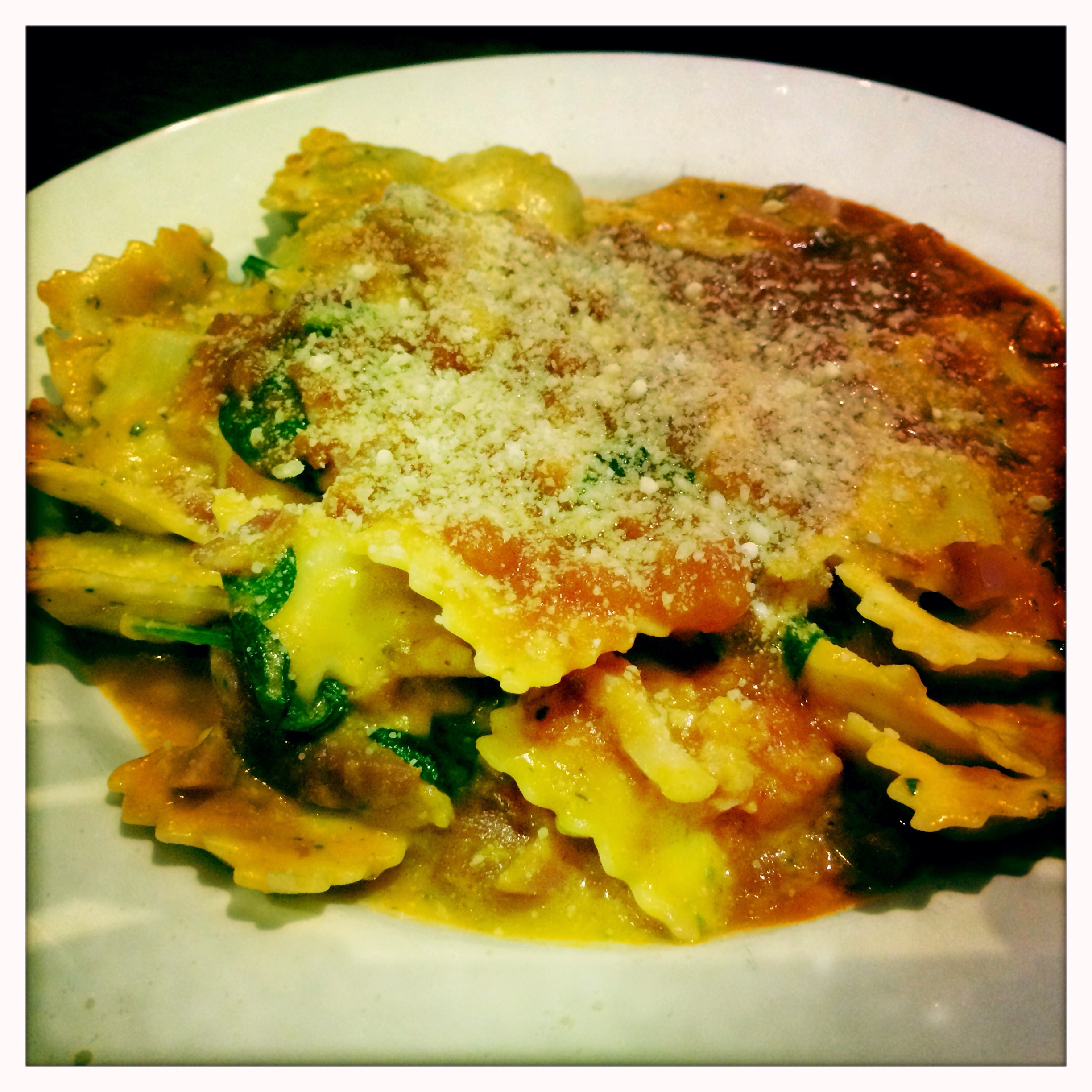Ravioli Florentina – meat filled pillows of pasta, tossed with bacon, baby spinach and white wine in a Napoli and cream based sauce for AU$12.40