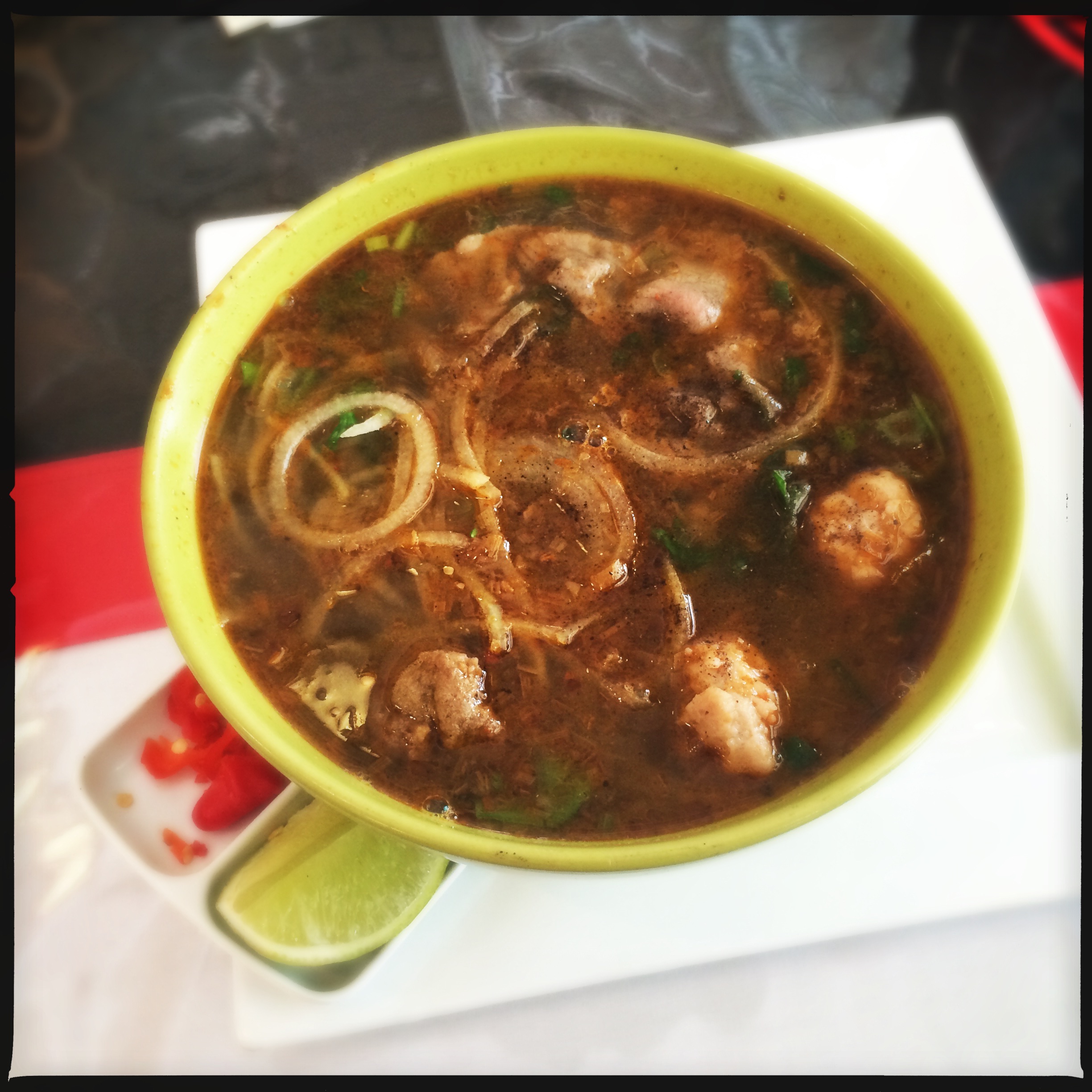 After our hello’s and a bit of general chit chat out the front of the shop we headed in and placed our orders at the counter. BMH already knew what she wanted so she ordered first leaving me to have a bit of a longer look over the menu. For someone who spends a lot of their spare time perusing menu’s online (hey it’s a vice of mine) for once I wasn’t at all prepared and this was in fact the first time I’d had a chance to view the menu. Shock! Horror! It didn’t take me long before I settled on the Lemongrass and Beef Chilli Noodle Soup ‘HUE’ Style for AU$10.90. The lady at the counter did mention to me that it was hot but I brushed her off. Please… I’m too hot to handle baby! I know I have tendency to go for mainly noodle dishes but in my defence I did seriously consider the Green Crispy Papaya Salad with Coriander Dressing for AU$9.90 (another regular dish of mine). It was the Coriander Dressing that turned me off. I don’t like coriander, it’s just too overpowering for me.