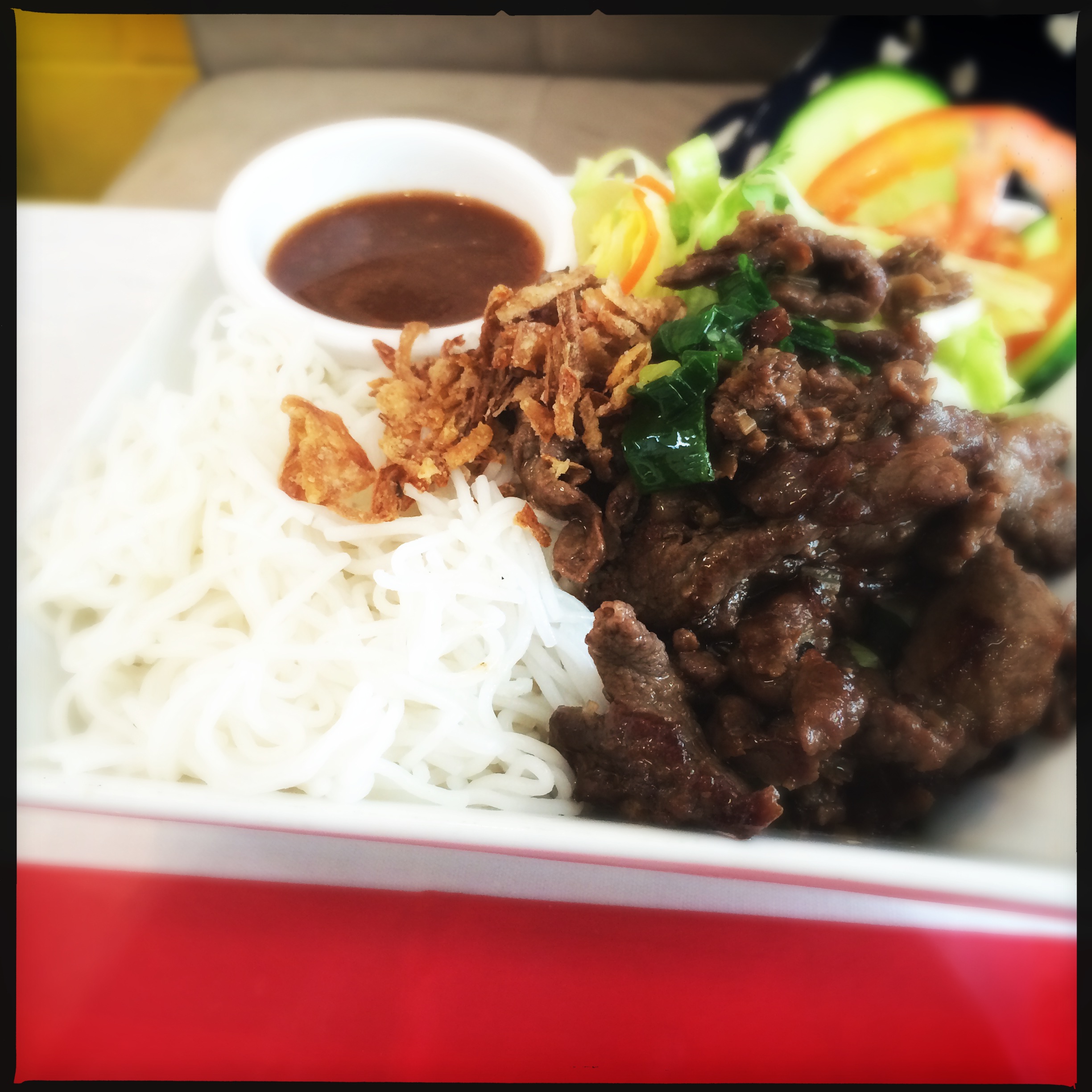 Enough about that – It didn’t take long before our lunch to arrive at our table – I’m actually not sure if the service is always that prompt or it was just that we were the first one’s there for the lunch trade. My guess is that it’s always prompt or there is no way that BMH would keep going back. My noodle soup was quite large in size and stature with a bit of chilli and lime on the side. The broth was somewhat flavoursome, mostly the chilli kind, but generally didn’t have much depth to it. The thinly sliced beef was lovely and tender and this was the first to go from my bowl followed by the noodles which were still a little bit firm to bite. Exactly the way they should be IMO. I then proceeded to work down the large amount of soup in my bowl only to be faced with nearly choking on chilli. It’s not that it was particularly hot but more it just went down the wrong way, kind of like when you breath in Milo. THAT SHIT BURNS!!! Tears ran down my face, I couldn’t breath and I immediately turned around casing the nearby drinks fridge for anything that may quench the choking burn. Fortunately for me, after a sheer moment of panic, the burning subsided, I wiped away the tears and our conversation continued as per normal.