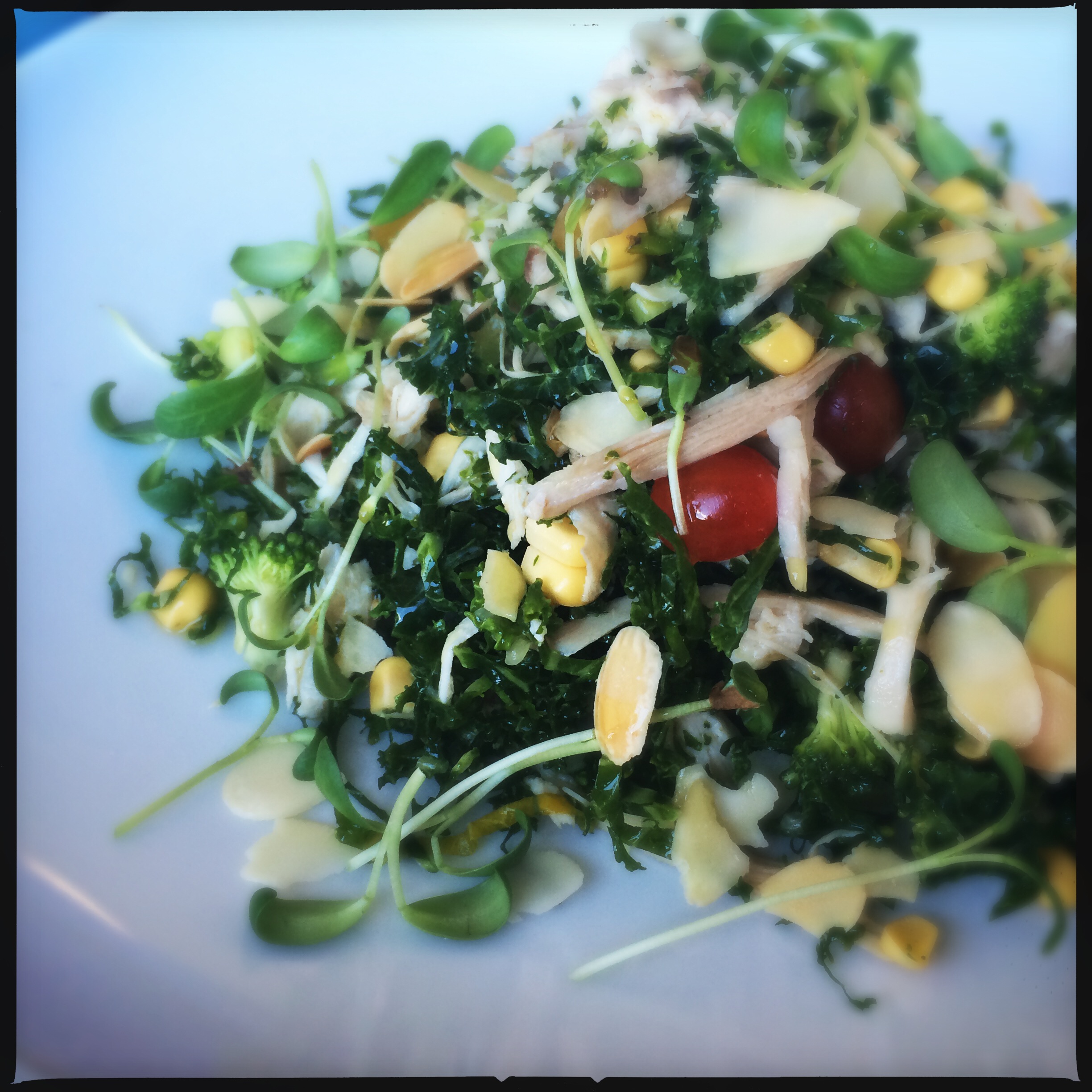 Healthy Green Salad with Raw Kale, Broccoli, Corn, Herbs, Preserved Lemon (AU$14.50) and added Poached Chicken (AU$4.50)