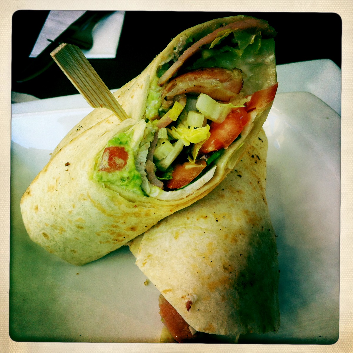 Most recently MS and I went to Mr Wolf for lunch last week. Nick the owner gave us a rundown of just what the specials on the Specials Board were… Malay Curry with Fried Rice made by a Malay woman and another dish that I’m failing to recall (must be old age, that and I keep forgetting to take my Fish Oil). They both sounded delicious but MS and I were steering towards the Burger/Club Sandwich section of the menu. Not wanting to eat too much bread with my lunch I requested to have the Mr Wolf Beef Burger in a wrap instead of on a bun and figuring that this was a superb idea (newsflash: all my ideas are superb) MS opted for the Chicken and Smashed Avocado Club also as a wrap. Now I don’t want to be a pain in the ass for the Chef/Cook at Mr Wolf and suggest that people should do this regularly but I am merely trying to point out that changing it up a little wasn’t a problem. In the meantime MS ordered a Banana Smoothie with Banana (der), Vanilla, Honey, Ice Cream and Yogurt, while I ordered a Flat White.