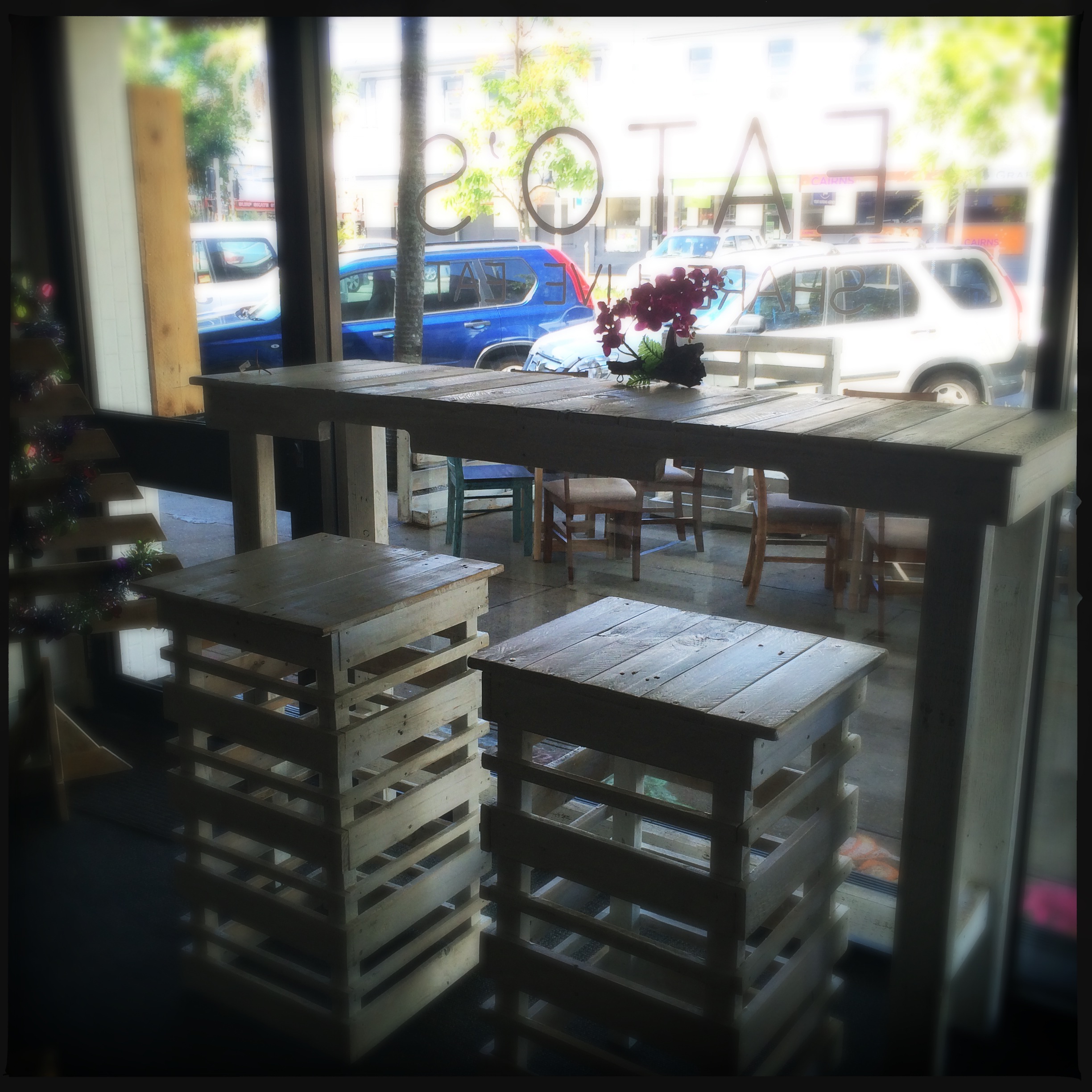 Back to our lunch… HH and I were greeted at the door and shown into the dining area by the friendly waitress who provided us with menu’s and water and directed us towards the counter for when we were ready to order. HH who’d had coffee there earlier in the week gushed about the pallet furniture that is not only part of the décor at Eato’s but also up for sale, again with profits going to charity. In fact according to their menu everything is for sale, including their staff. Sadly though for HH the white three piece set that he wanted so badly for his garden had already been sold – yet to be picked up, although there is more on it’s way.
