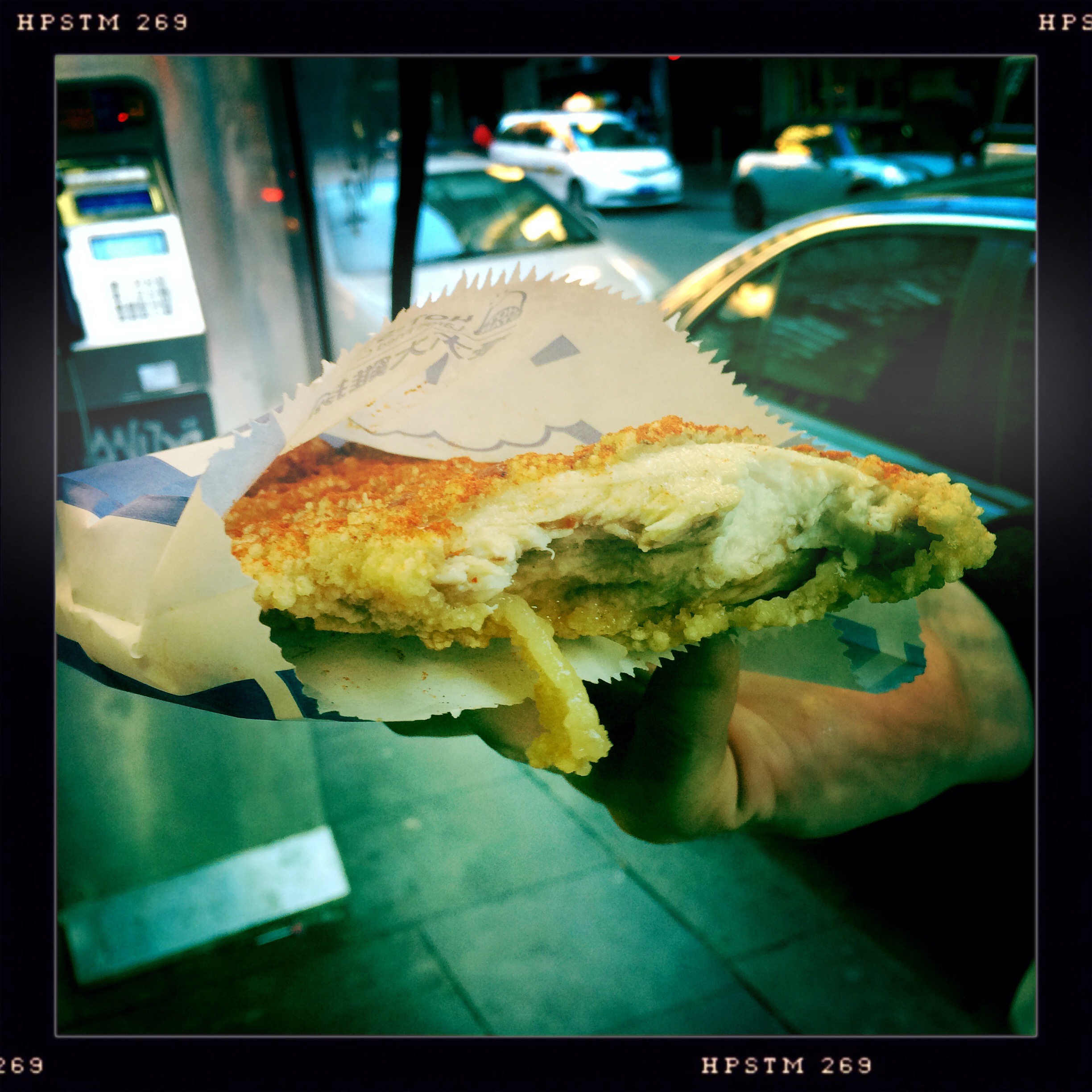 It’s a CASH ONLY kind of gig and for a mere AU$7.90 a hit, it’s a pretty good deal, especially when it’s cooked to order – that way you know it’s fresh – freshly fried anyway. The guy at the counter asked if we wanted Original or Spicy to which MS and I decided that we wanted ‘spicy’. He gave us a small plastic bag and a ticket with a number and we stepped aside, laying in wait for our ‘afternoon snack’. We waited about 10 minutes until with expert precision the guy working the deep fryer began to pull each chicken breast from the bubbling hot cottonseed oil, bag them up and call the individuals numbers of the hungry chicken lovers waiting curb side. MS and I spotted a couple of breasts that were basted in some sticky brownish sauce and then coated in sesame seeds. We had no idea what they were (possibly the lemon chicken?) but we both wished we had gotten that one – the grass is always greener.