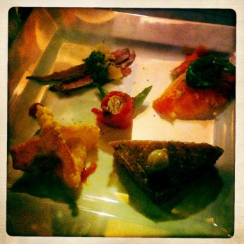 Australian Antipasto with Kangaroo Terrine with Pickled Kakadu Plum, Crocodile Wonton with Red Pepper Jam, Lemon Aspen Ocean Trout Gravlax, Emu Carpaccio, Goats Cheese and Roast Capsicum Roulade (AU$23)