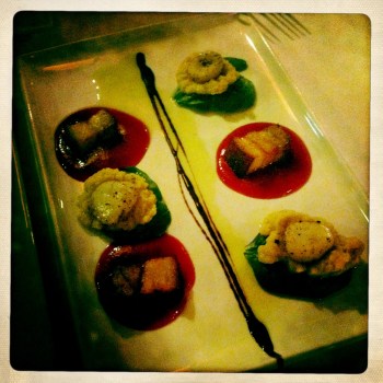 Twice Cooked Pork Belly with Seared Queensland Scallops, Davidson Plum Jam and Cauliflower Puree (AU$21)