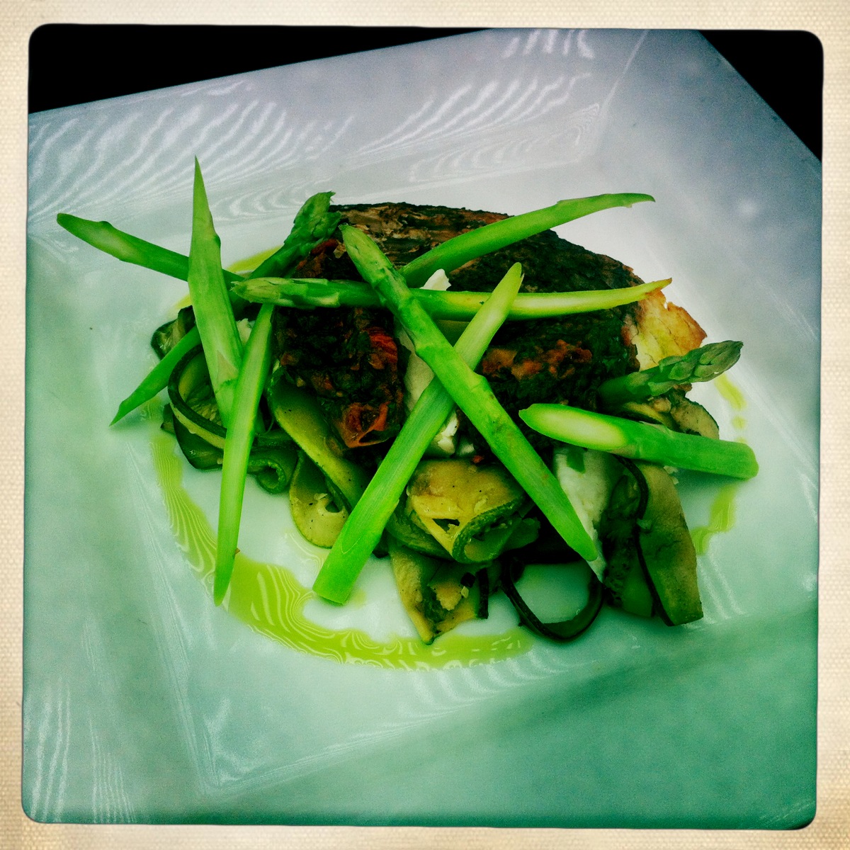 Our meals arrived in good time and after a bit of a photo shoot of the meals we tucked in. EG’s fillet of Barramundi was a very decent serve and was succulent and cooked to perfection. The greyish skin that was still on top was slightly crispy and contrasted well with the bright green asparagus on top. The asparagus was crisp and not overcooked, the way asparagus and any other greens for that matter should be. The only problem with E’s meal was the cold vegetables on the side. It looked a bit like Ratatouille to me and tasted like it. There was some zucchini, some capsicum and Tomato as well. It was cold and had been served pretty much straight from the fridge which kind of took away from the meal a little and E said that it would have been much nicer if they had heated it up a to match the temperature of the rest of the meal. I tended to agree with her.
